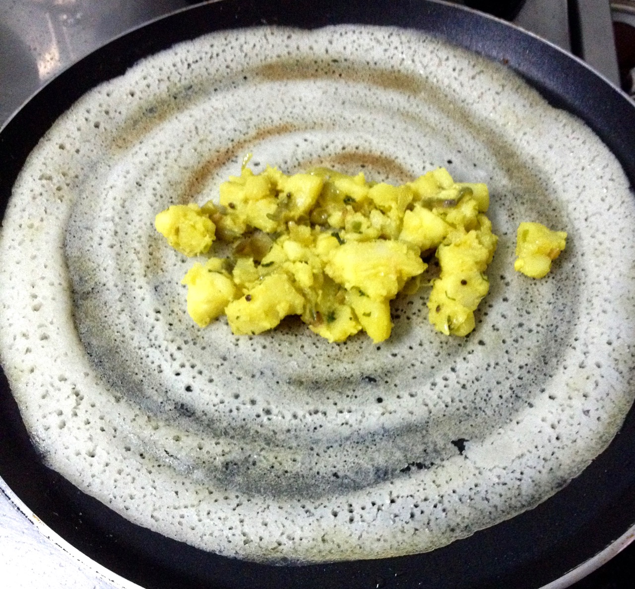 Masala Dosa is a popular South Indian snack. Dosa is a thin crispy crepe made from rice and split black gram batter and masala is the potato onion curry (bhaji). It is accompanied by sambar and coconut chutney. It can be served for breakfast or as an evening tea time snack.